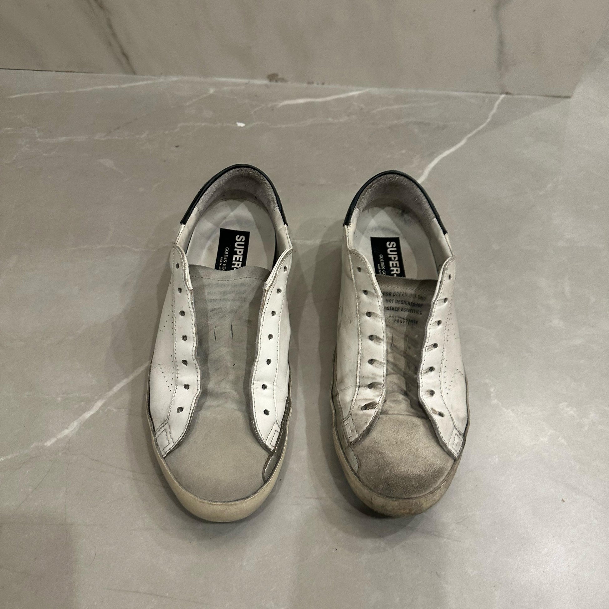 Scrub with a brush, then wipe with a microfiber towel, and repeat if needed. Let the shoe air dry.